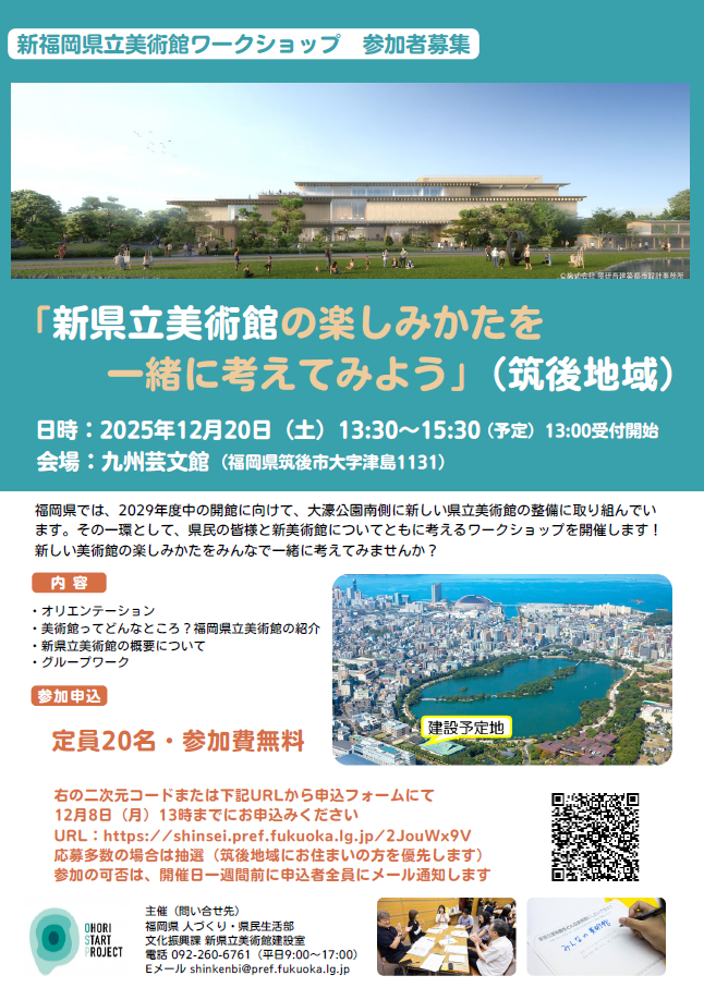 福岡県では、2029年度中の開館に向けて、大濠公園南側に新しい県立美術館の整備に取り組んでいます。その一環として、県民の皆様と新美術館についてともに考えるワークショップを開催します!新しい美術館の楽しみかたをみんなで一緒に考えてみませんか?