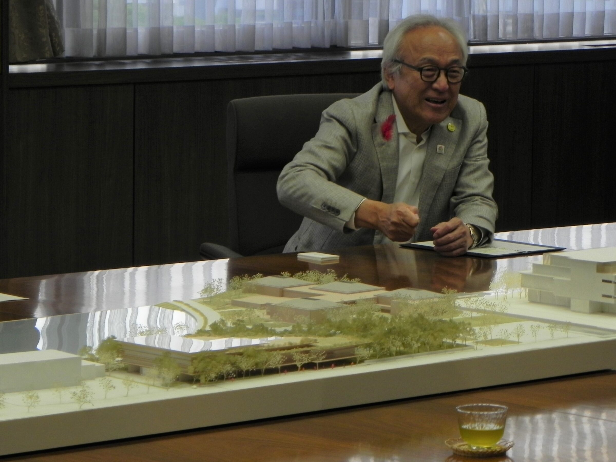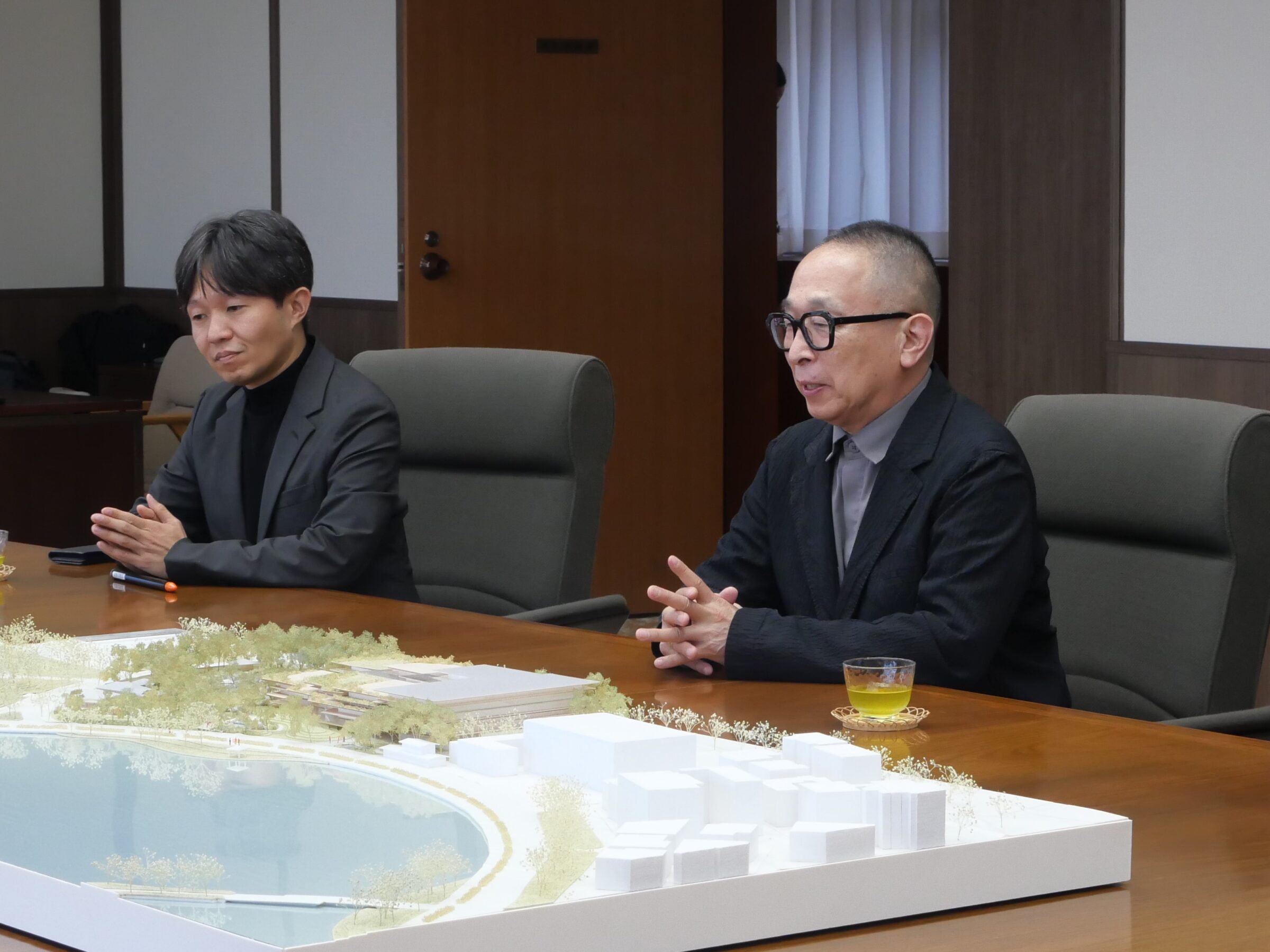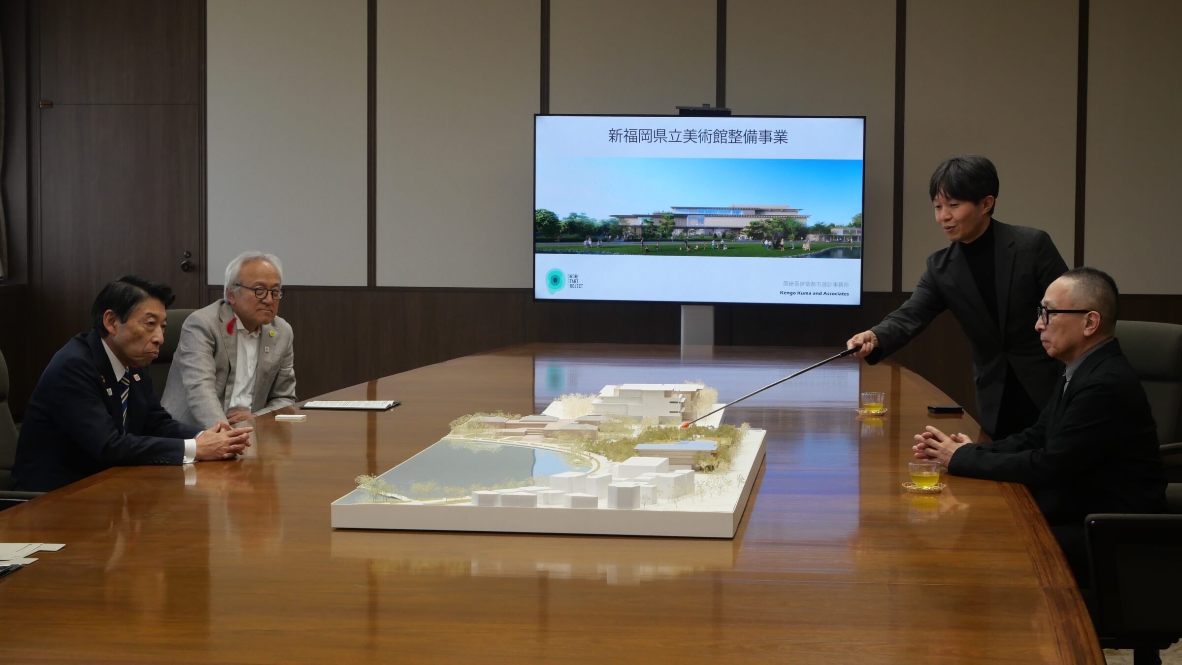 これに伴い、10月15日、新県立美術館の設計主担当である隈研吾建築都市設計事務所の名城俊樹さんと佐藤卓さんが知事と藏内勇夫福岡県議会議長を訪問されました。