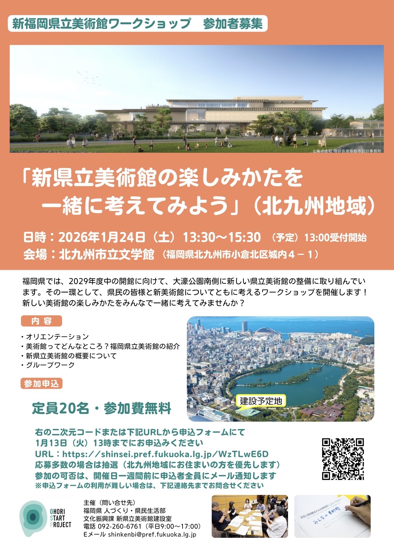福岡県では、2029年度中の開館に向けて、大濠公園南側に新しい県立美術館の整備に取り組んでいます。その一環として、県民の皆様と新美術館についてともに考えるワークショップを開催します!新しい美術館の楽しみかたをみんなで一緒に考えてみませんか?